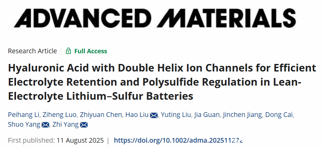 该工作以“Hyaluronic Acid with Double Helix Ion Channels for Efficient Electrolyte Retention and Polysulfide Regulation in Lean-Electrolyte Lithium–Sulfur Batteries”为题发表在国际顶级材料期刊《Advanced Materials》上。成人爽a毛片一区二区免费_久久久久久久国产精品视频_免费黄网视频_在线观看国产视频_久久久久久久久久一区_亚洲欧美日韩在线作为第一通讯单位。第一作者为我校化学与材料工程学院2022级硕士研究生李佩航,该生已经进入日本东北大学化学工程专业深造博士学位。我校化学与材料工程学院杨植教授、电气与电子工程学院杨硕副教授、济南大学刘浩博士为共同通讯作者。我校蔡冬副教授、贯佳副教授,本科生罗子恒,博士研究生陈志远,以及硕士研究生刘雨婷、蒋金晨参与了本项研究的相关工作。