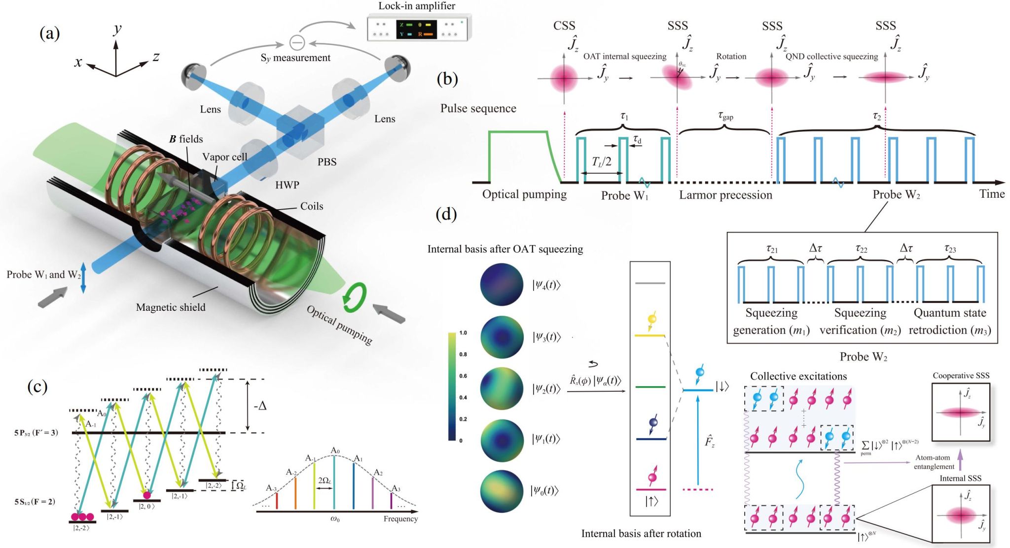 图1. (a)原子内外态协同自旋压缩实验设置示意图;(b)光场脉冲设置示意图;(c)原子能级结构与激光场相互作用示意图;(d)原子内外态协同自旋压缩原理示意图。