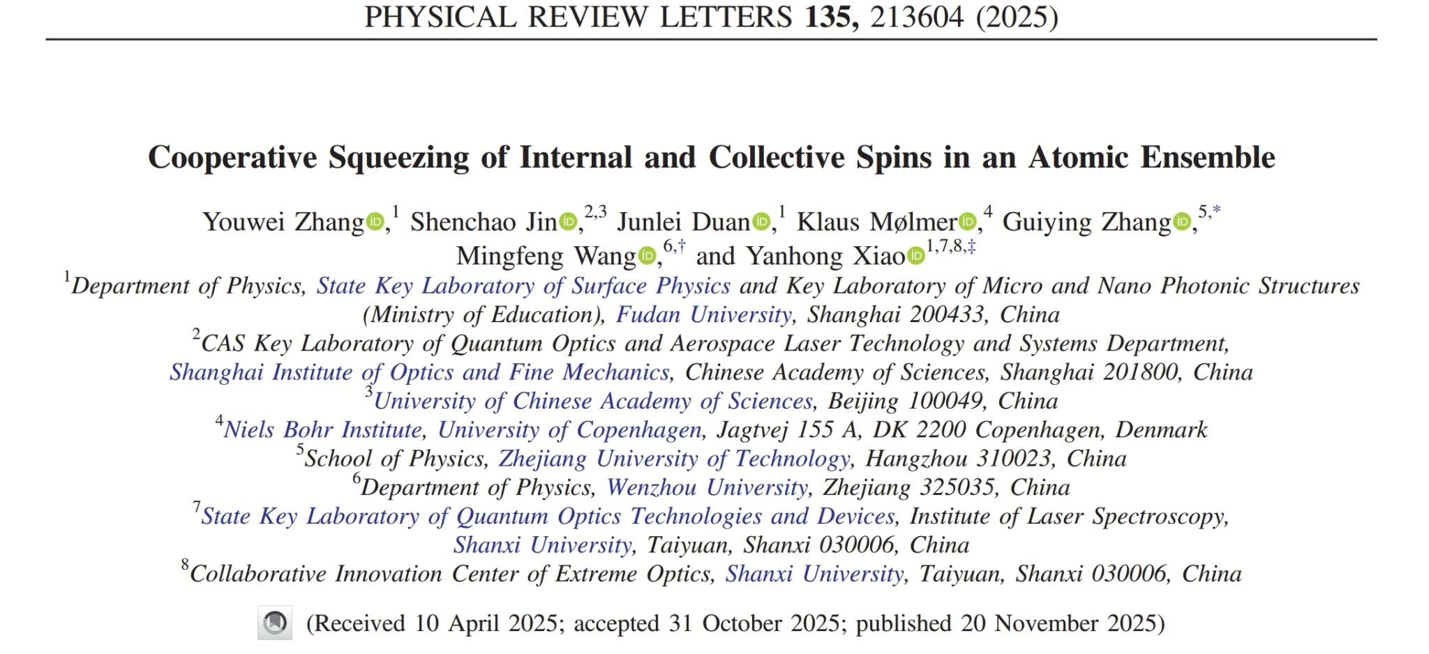 相关研究结果以题“Cooperative Squeezing of Internal and Collective Spins in an Atomic Ensemble”发表于近期的《Physical Review Letters》上,我校数理学院王明锋副教授、复旦大学肖艳红教授和浙江工业大学张桂迎副教授为论文共同通讯作者,博士生张有为为论文的第一作者,哥本哈根大学Klaus Mølmer教授为该工作提供了重要指导。该项目获得了“量子通信与量子计算机”国家科技重大专项、上海市科学技术委员会项目、国家自然科学基金、山西省“1331工程”专项基金、浙江省自然科学基金,以及丹麦国家研究基金会的支持。