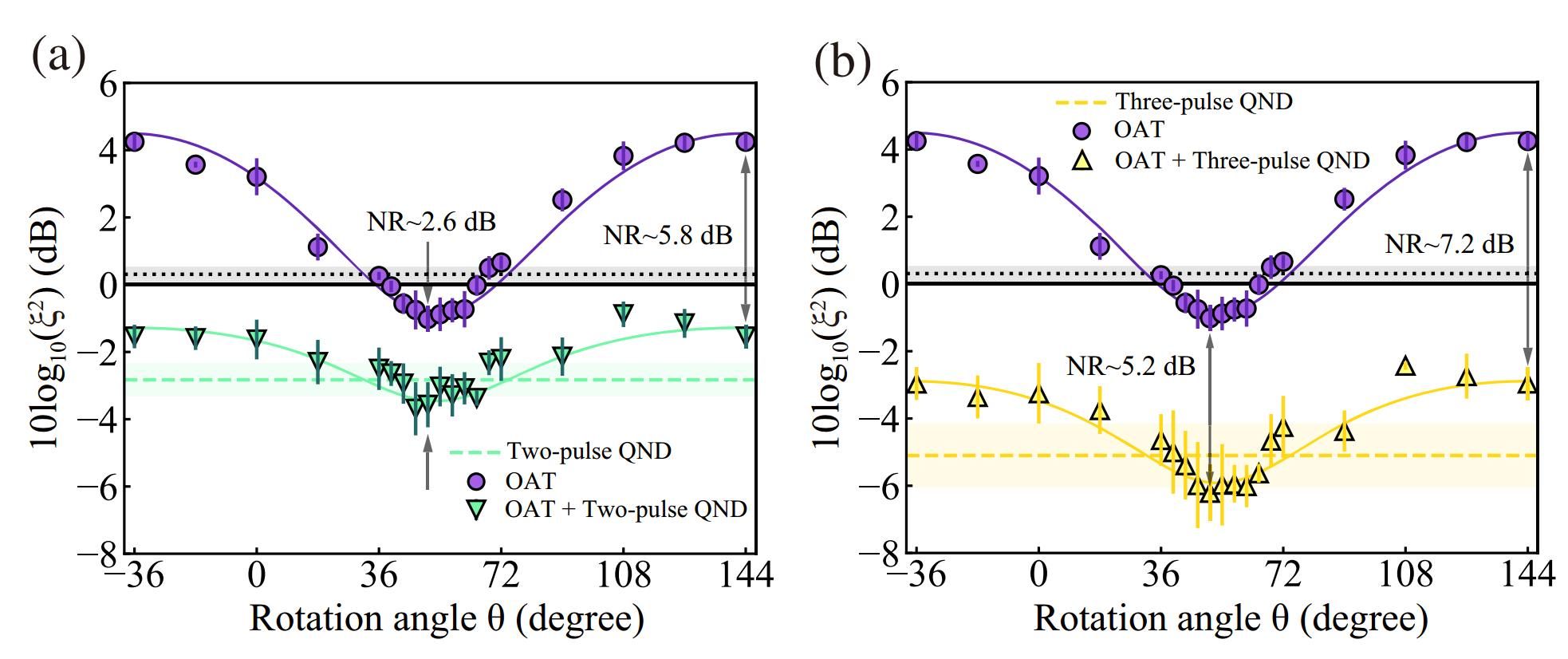 原子自旋压缩的压缩程度通常采用压缩度ξ²来度量,当ξ²小于1时,表示体系存在自旋压缩。图2展示了我们的实验结果:在仅进行内态压缩的情况下,获得的最佳压缩度约为-1.02 dB;而在内外态协同压缩的条件下,最佳压缩度提升至约-3.57 dB。该结果相较于仅实施外态压缩时获得的-2.83 dB提高了-0.74 dB,从而在实验上证实了原子内外态协同自旋压缩的实现。进一步研究发现,采用“过去量子态”技术(亦称三脉冲技术),可将自旋压缩度进一步提升至-6.21 dB,这是目前在热原子体系中所实现的最高压缩水平。