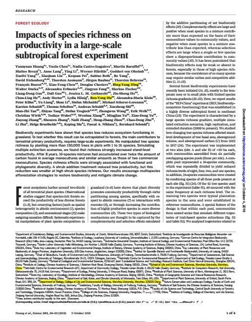 相关论文:Yuanyuan Huang et al.: Impacts of species richness on productivity in a large-scale subtropical forest experiment, Science, 5 October 2018. DOI: 10.1126/science.aat6405