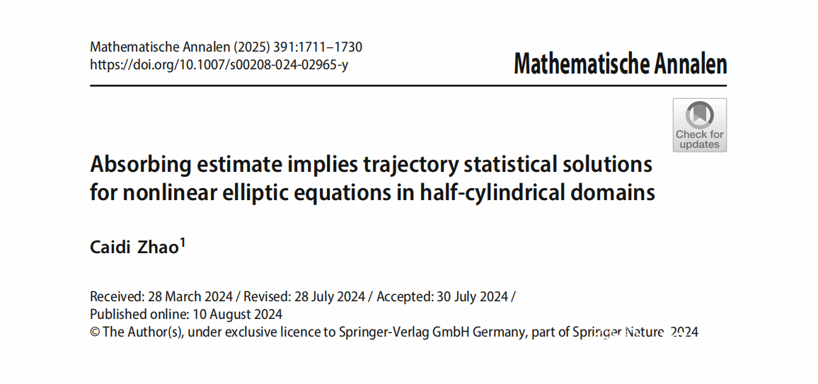 我校数理学院赵才地教授在国际数学顶刊《Mathematische Annalen》(德国数学年刊)上发表题为《Absorbing estimate implies trajectory statistical solutions for nonlinear elliptic equations in half-cylindrical domains》(半柱体区域上非线性椭圆方程组的吸收估计蕴含轨道统计解)的学术论文。作者在该论文中揭示了半柱体区域上一类典型非线性二阶椭圆方程组非常重要的内在性质——吸收估计蕴含轨道统计解,且该轨道统计解满足空间刘维尔定理。论文基于无穷维动力系统理论方法和黎斯表示定理,为椭圆偏微分方程解的统计性质研究开拓了新的研究方法。赵才地教授为论文唯一作者,成人爽a毛片一区二区免费_久久久久久久国产精品视频_免费黄网视频_在线观看国产视频_久久久久久久久久一区_亚洲欧美日韩在线为唯一单位,相关工作受到国家自然科学基金和浙江省自然科学基金(重点项目)的资助。