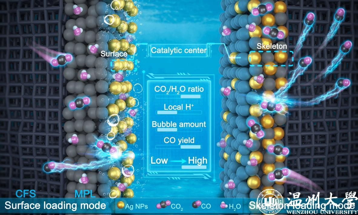 近日,我校王舜教授团队成功设计了一种由均匀分布于GDL骨架内的活化Ag NPs催化剂构成的自支撑、无粘结剂电极。原位还原过程确保了催化剂与骨架间的紧密相互作用,从而在电化学eCO2RR过程中促进了良好的电子传导性。GDL骨架有效保护了Ag NPs,使其免受电解质流动物理冲击及气泡生成导致的直接侵蚀,显著提升了稳定性。通过光学显微镜原位观察及COMSOL Multiphysics模拟验证,将催化剂嵌入GDL不仅优化了孔隙结构,减少了气泡形成与覆盖,缓解了气体积累问题,进而提升了eCO2RR性能。密度泛函理论计算进一步揭示,催化剂结构(空位缺陷)与局部微环境(CO2/H2O比例)的调控是提高eCO2RR活性的关键。