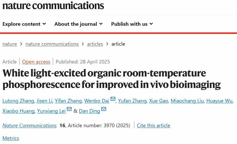 该论文以“White light-excited organic room-temperature phosphorescence for improved in vivo bioimaging”为题发表于国际顶级期刊⟪Nature Communications⟫上。成人爽a毛片一区二区免费_久久久久久久国产精品视频_免费黄网视频_在线观看国产视频_久久久久久久久久一区_亚洲欧美日韩在线为第一通讯单位,化学与材料工程学院22级硕士生张鹭桐为第一作者,南开大学李济森博士为共同第一作者。化学与材料工程学院戴文博博士、雷云祥特聘教授以及南开大学丁丹教授为共同通讯作者,相关工作得到了国家自然科学基金的支持。据悉,这是该课题组以成人爽a毛片一区二区免费_久久久久久久国产精品视频_免费黄网视频_在线观看国产视频_久久久久久久久久一区_亚洲欧美日韩在线为第一通讯单位发表的第三篇Nature Communications。