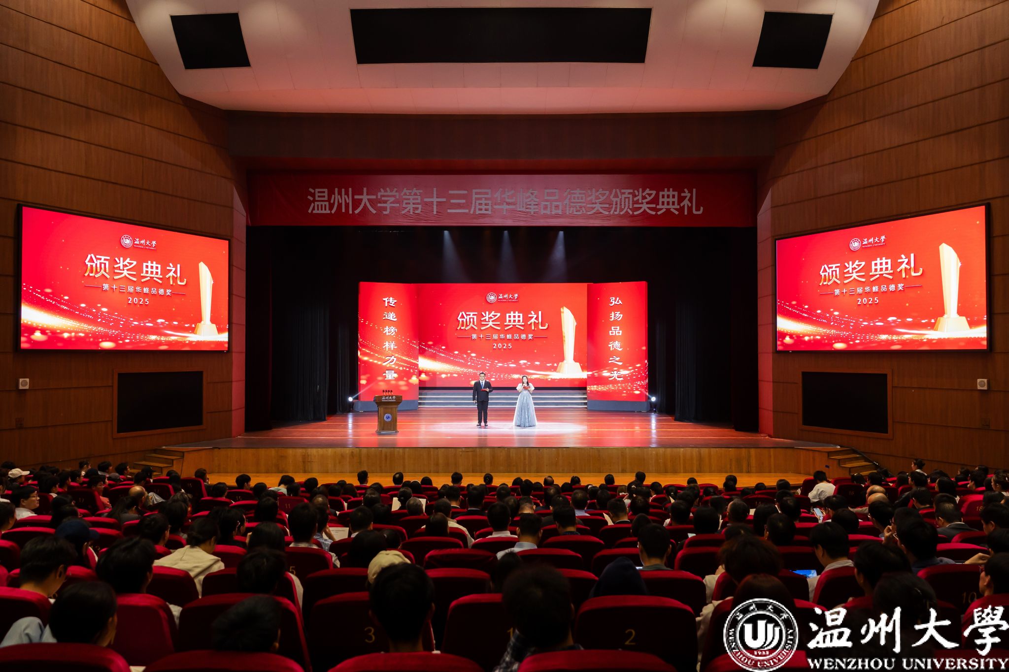 校党委书记钱强致辞。他指出,“华峰品德奖”设立十三载,这一奖项早已超越荣誉本身,成为我校道德风尚建设的精神丰碑、引领师生向上向善的鲜明旗帜,“华峰品德奖”表彰的不仅仅是关键时刻的壮举,更是平凡岁月中的坚守,弘扬的不仅是业绩卓越的贡献,更是根植内心的本真。他肯定获奖师生用实际行动诠释品德,称赞他们是温大精神的生动诠释者与有力践行者。钱强对全体师生提出三点期望:坚守“初心”,以教育家精神铸魂,教师要以“大先生”为目标,做传授知识的“经师”与涵养德行的“人师”;秉持“匠心”,以卓越品质立业,师生需脚踏实地追求卓越,学生要外化品德为学风言行;奉献“爱心”,以服务奉献担当,将“小我”融入“大我”,投身志愿服务与社会实践。他希望师生见贤思齐,守好品德“基线”,为学校创建浙江省高水平大学、建设“双一流”高校提供精神动力。