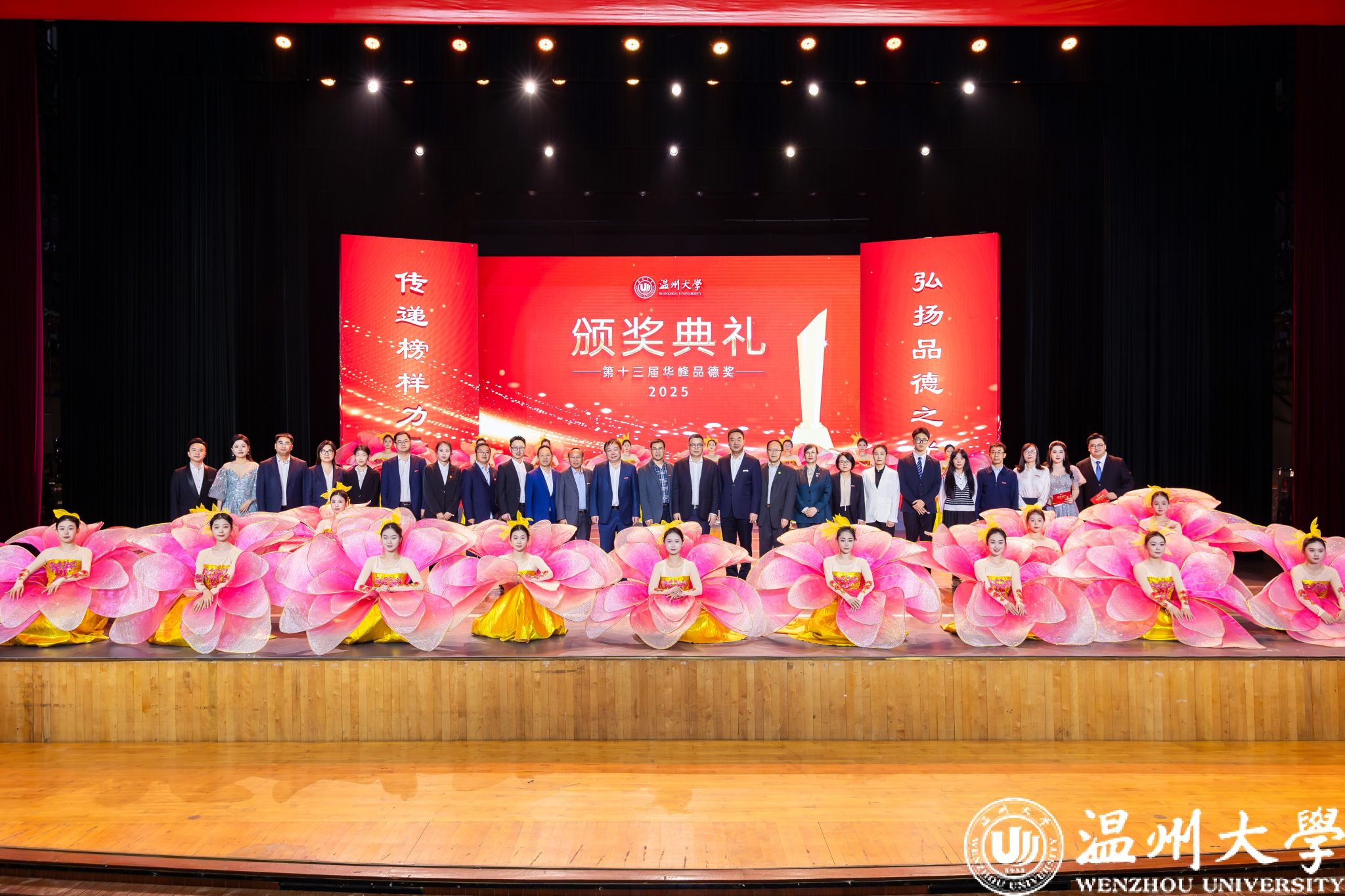 颁奖典礼现场,毛华配、叶慕心、林玉双、顾雯瑶、矫镇红、彭小明、董长昆、珍稀濒危野生动物救助团队、青少年法治教育协会团队、招生就业联合会团队10位道德模范个人(集体)获表彰奖励。校领导与华峰集团领导分别为获奖者颁奖,致敬多元领域的品德标杆。