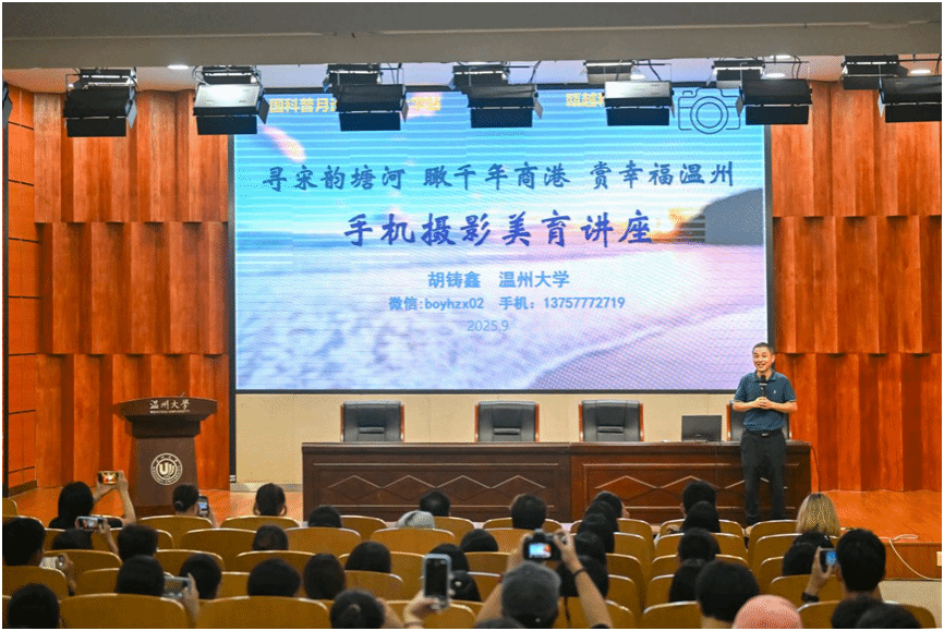 活动吸引了近300位听众。一开场,观众便被一幅幅校园风光、温瑞塘河宋韵风貌、商港历史图景与现代城市活力的影像集锦所吸引,那些承载着地域文化记忆的画面,瞬间唤醒了大家用手机探索本土之美的热情与期待。本次巡讲特邀摄影领域资深专家胡铸鑫主讲,他也是中国图象图形学学会数字文化遗产专业委员会委员,他不仅拥有扎实的摄影技术功底,更对摄影美育有着独到且深刻的理解。