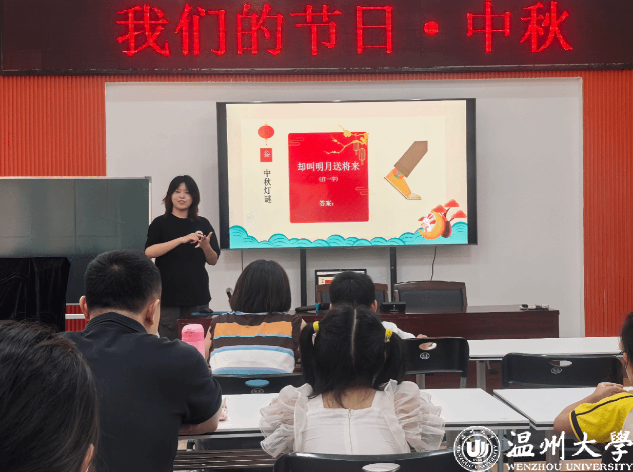课程伊始,马克思主义学院项目团队的学生王子涵以一轮皎洁的明月图片引入,瞬间吸引了孩子们的目光。她用生动形象的语言,娓娓道来中秋节的起源,从古老的月神崇拜到“嫦娥奔月”的神话传说,再到唐宋时期赏月风尚的定型,清晰地勾勒出中秋节的历史发展脉络。小朋友们听得津津有味,仿佛穿越时空,感受到了古人对于团圆和丰收的美好祈愿。