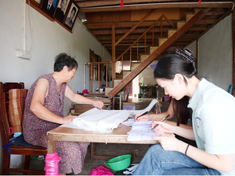 随后,队员们来到了一位阿婆的家中,阿婆说她的普通话不够标准,但在交流的过程中,她却能够流利地回答。她一边做着手里的工作,一边笑着说:“年轻时因为工作需要,就自己学普通话、说普通话,现在回村里,大家都讲方言,普通话就说不上喽。”阿婆的话既印证了城乡流动对普通话推广的促进作用,也反映了乡村语言环境对普通话普及的制约。