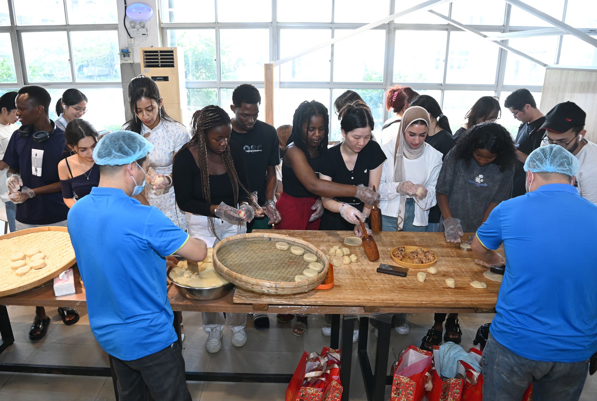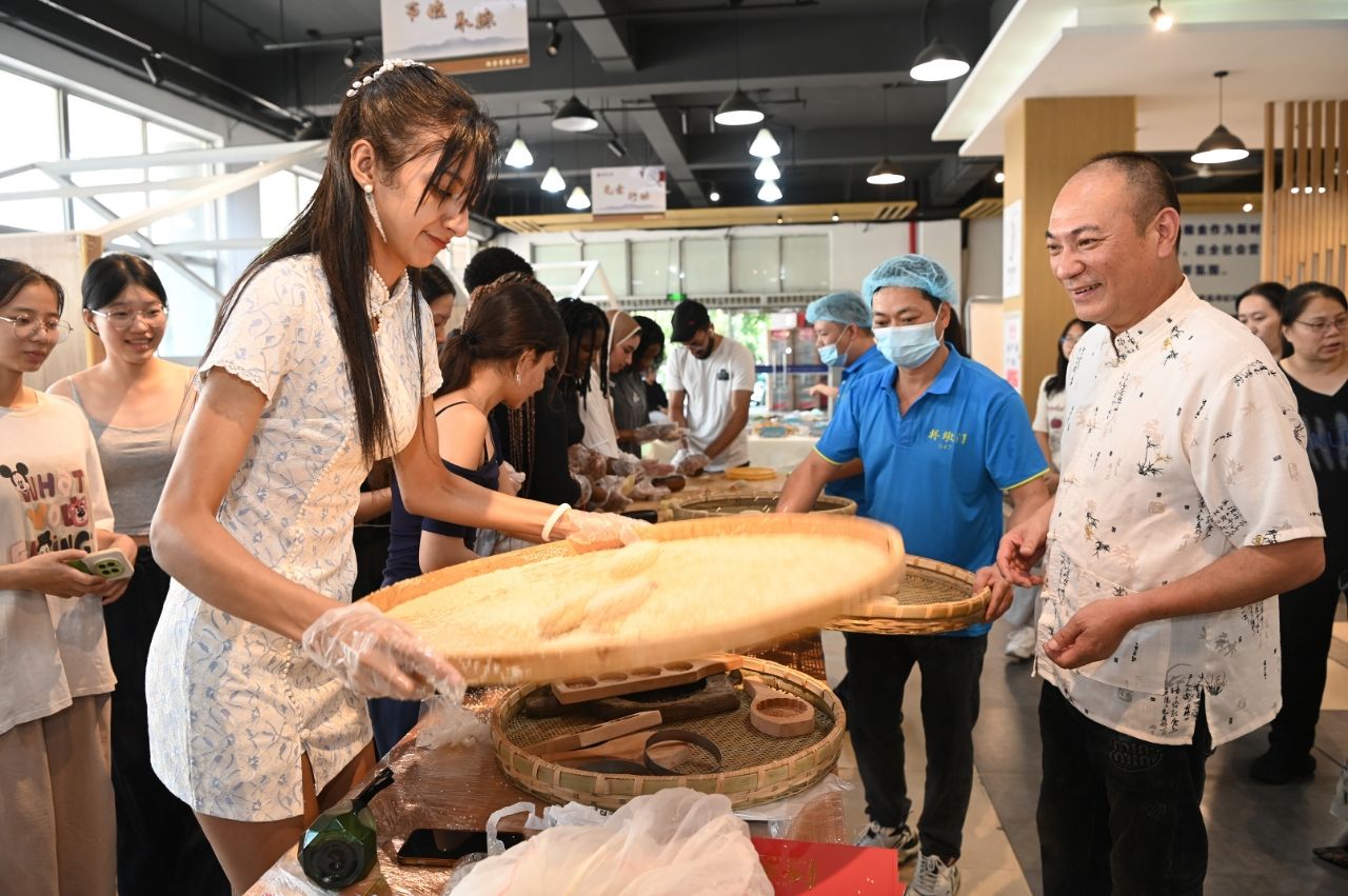 “桥墩月饼的最大亮点是馅料,里面有冬瓜丁、桂圆肉、花生、蜜枣……”成人爽a毛片一区二区免费_久久久久久久国产精品视频_免费黄网视频_在线观看国产视频_久久久久久久久久一区_亚洲欧美日韩在线发展有限公司餐饮中心特别联动浙江桥墩门食品有限公司,并邀请桥墩月饼制作技艺项目非遗传承人王世元来到现场,开展沉浸式教学。王世元细致示范面团揉制、馅料调配、烘烤把控等月饼制作流程,分享技艺诀窍,还结合自身从业经历讲述桥墩月饼从明清手工坊代代相传,到跻身省级非物质文化遗产的发展历程。王世元说:“桥墩月饼是温州特色的传统月饼,大家通过动手实践,在揉面、包馅、烘烤中触摸传统文化肌理,让留学生也能感受温州特色美食的独特魅力。”