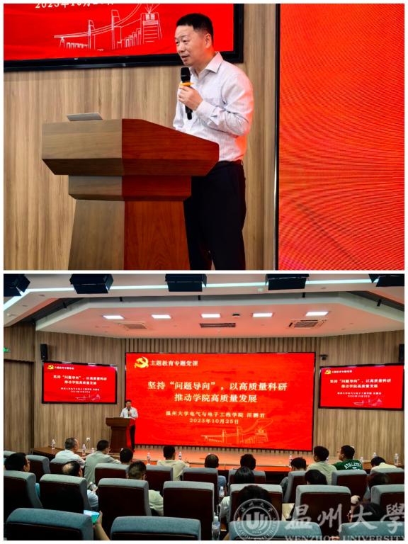 “今天我们来到乐清市正泰物联网传感产业园看发展、学思想、促行动,把主题教育专题党课搬到基层一线,就是要用习近平新时代中国特色社会主义思想指导实践、推动工作,以高质量党建引领推动学院高质量发展。”随后,电气与电子工程学院院长、党委副书记汪鹏君在正泰物联网传感产业园1号楼3楼报告厅给全体教师党员带来了一堂题为“坚持‘问题导向’,以高质量科研推动学院高质量发展”的主题教育专题党课。他表示,站在新的历史起点上,学院将积极发挥智力和人才优势,坚持创新驱动,勇攀科创高峰,培育优秀人才,在大力推进乐清电气产业集群高质量发展发展征程上勇当排头兵。